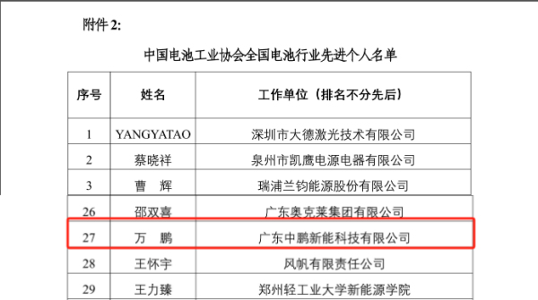 活動現(xiàn)場,中國電池工業(yè)協(xié)會向獲獎單位和個人進行了頒獎授牌。中鵬科技董事長萬鵬榮獲“全國電池行業(yè)先進個人”榮譽稱號。